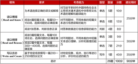 比赛题目:包括客观题若干道和议论文写作1篇,具体赛题模块见下表
