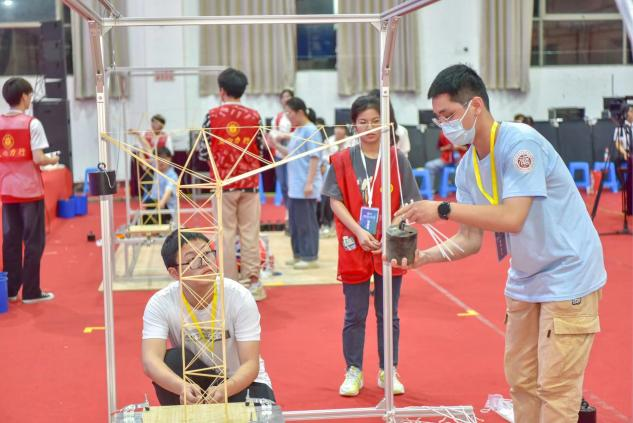结合近几年土木工程上因发生的重大结构坍塌事故而产生的救援工程本次大赛以铁轨上行驶的自行式塔吊”为赛题,并采用装配式”结构要求学生用竹竿与竹皮、胶水为材料设计并制作一个自行式塔吊。选手通过团队合作进行理论方案的设计和多种工况下塔吊模拟加载设计出最具性价比的模型和运载方案。经长达9小时的现场制作,回答专家评委的提问并加载成功。