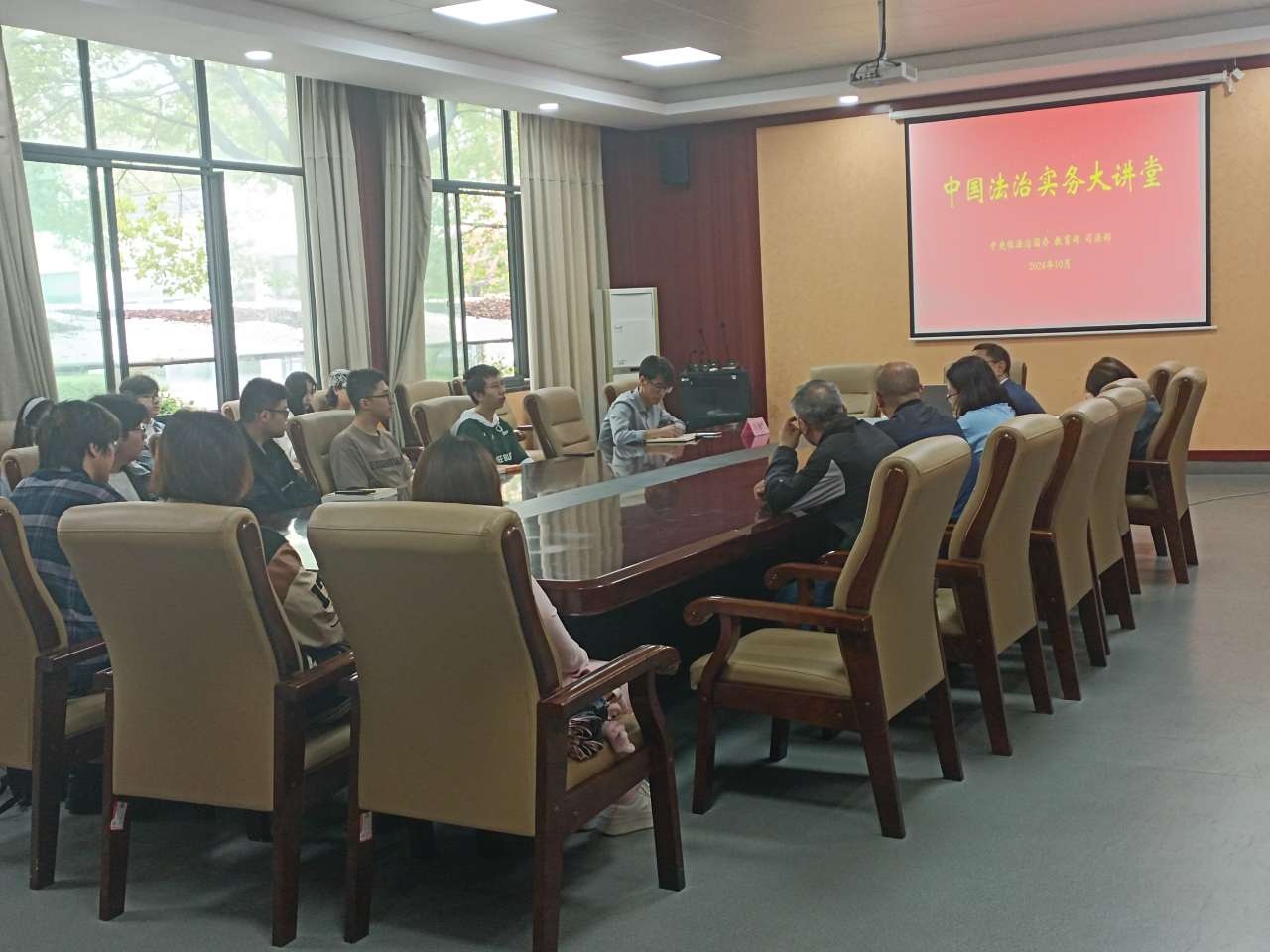 为深入学习贯彻习近平法治思想,贯彻落实党的二十大精神和二十届三中全会精神,贯彻落实全国教育大会精神,完善以实践为导向的法学院校教育培养机制,将生动的中国法治实践转化为高质量的中国法学金课,提升法学人才自主培养质量。教育部高等教育司于2024年10月17日上午在中国人民大学举办中国法治实务大讲堂,梁柏台法学院在教学楼3-106会议室设立线下分会场,组织师生收看中国法治实务大讲堂启动仪式暨第一讲。教务处副处长刘泓鑫、梁柏台法学院党总支书记陈跃男、副院长陈金东、教研室主任、专业老师及部分学生参加。