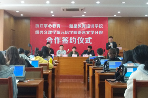 3月14日下午,由语言文学分院与浙江掌心教育合作共建的“新星师范班”首批学员产生。教务处相关负责人、分院相关负责人、新星教育培训学校相关负责人出席签约仪式,“新星师范班”首批学员参加签约仪式。据了解,“新星师范班”是在2014年12月语言文学分院与新星教育培训学校合作共建“创新实践基地”的基础上,通过多次良好合作开展的又一次高水平的校企合作。