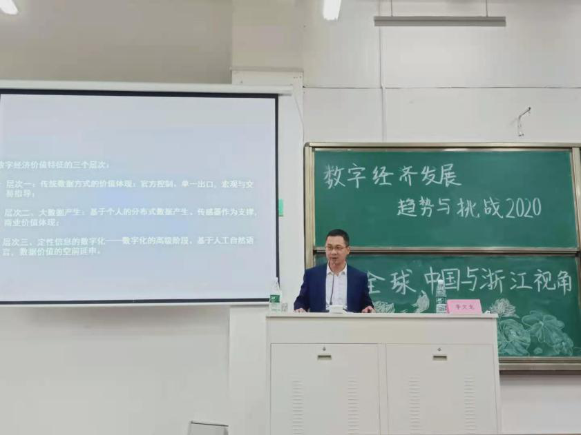 11月18日晚上,东盟经济研究院院长、环亚数字经济研究院首席经济学家李文龙博士在绍兴市文理学院元培学院1-310阶梯教室作专题讲座,主题为数字经济发展趋势与挑战。经济与管理学院副院长王会龙主持讲座。