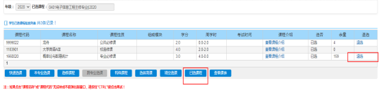 注意:在选课时间截止前可改选,返回“学生选课”界面,进入“已选课程”、查看已选课程后点击“退选”,重新选课,系统会保存最后一次提交记录。